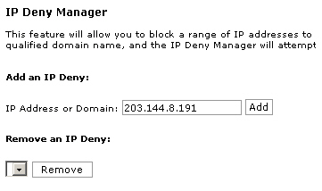 IP Deny Manager เป็น Tool ใช้สำหรับ Block IP ที่ไม่ต้องการไม่ให้เข้าเว็บไซต์ของเราได้ เลือกที่เมนู IP Deny Manager ระบุ IP ที่ต้องการ รายละเอียดอื่น ๆ สามารถอ่านได้ที่ http://www.cpanel.net/docs/cpanel/ สอบถามรายละเอียดเพิ่มเติมได้ที่นี่